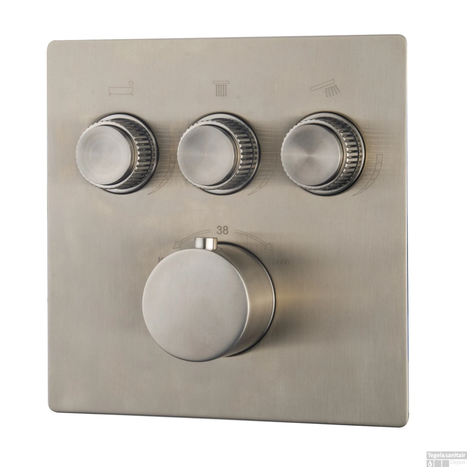 De Caral Klik Pro van Wiesbaden is een stijlvolle en hoogwaardige inbouwthermostaat met Smartcontrol. Dit Caral Klik Pro afbouwdeel voor de inbouwthermostaat 3-weg komt in de kleur Geborsteld Staal en beschikt over 3 functies. Zo kun je eenvoudig in één klik schakelen tussen de handdouche, hoofddouche en baduitloop. Door middel van de Smartcontrol bedieningsknoppen is de mengkraan gemakkelijk aan en uit te zetten. Daarnaast bepaal je door te draaien de gewenste waterdruk. De watertemperatuur is thermostatisch te regelen en heeft een begrenzer op 38 graden. Dit maakt dat de kraan ook veilig te gebruiken is door kinderen.