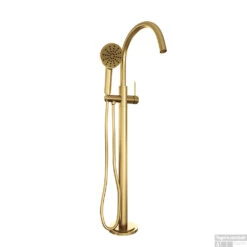 Deze badkraan met handdouche geeft uw badkamer een luxueuze en moderne touch. De uitloop is zwenkbaar. De kraan is van messing in de kleur geborsteld goud. Hij is tussen de 100,5 en 104,5 cm hoog. De uitloop is 30,3 cm lang.