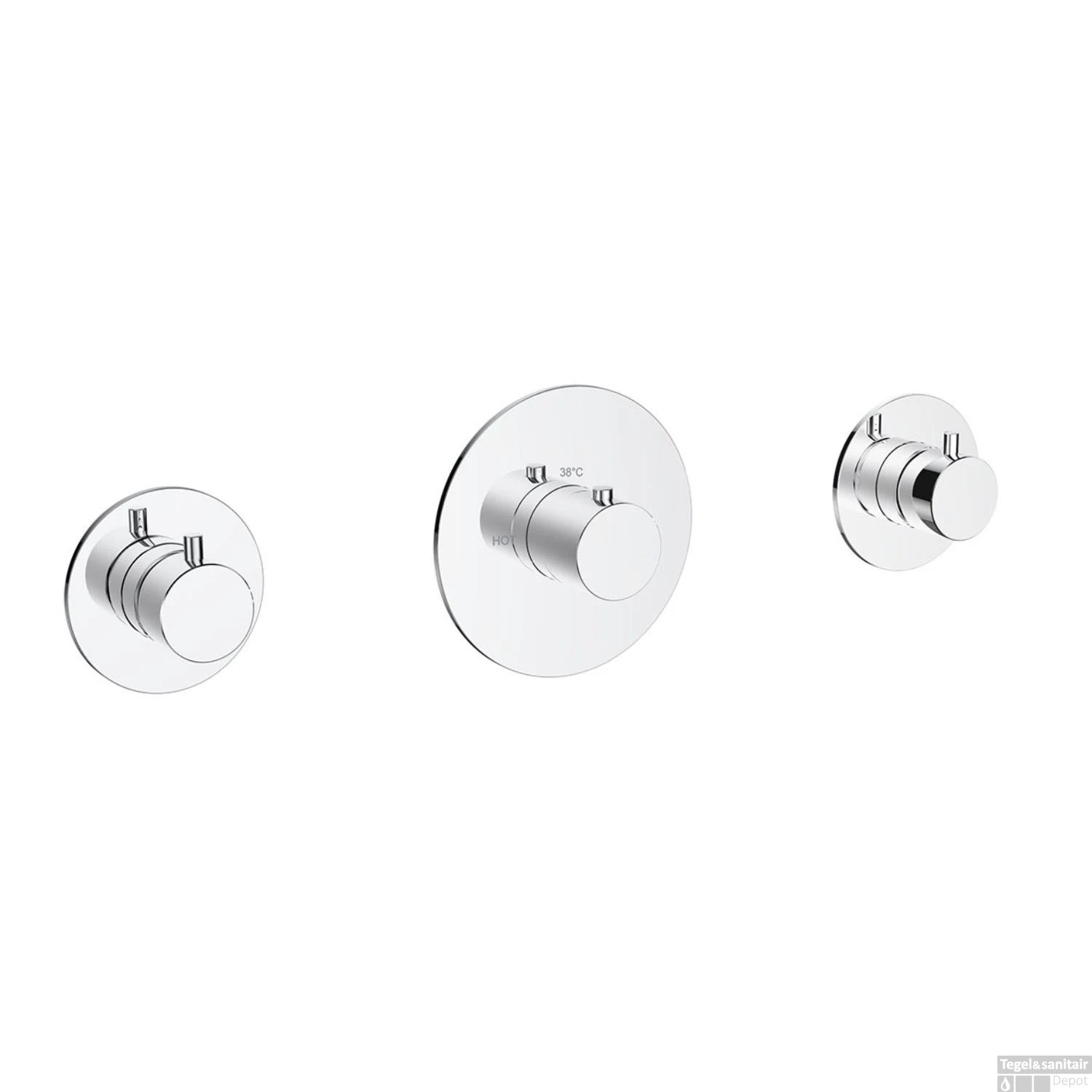 De set wordt geleverd met thermostatische badkraan, 2 stopkranen, een baduitloop, muuruitlaat, doucheslang en handdouche. Daarnaast heeft u de optie een alternatieve handdouche, baduitloop, doucheslang of muuruitlaat te kiezen, eventueel voor een meerprijs.