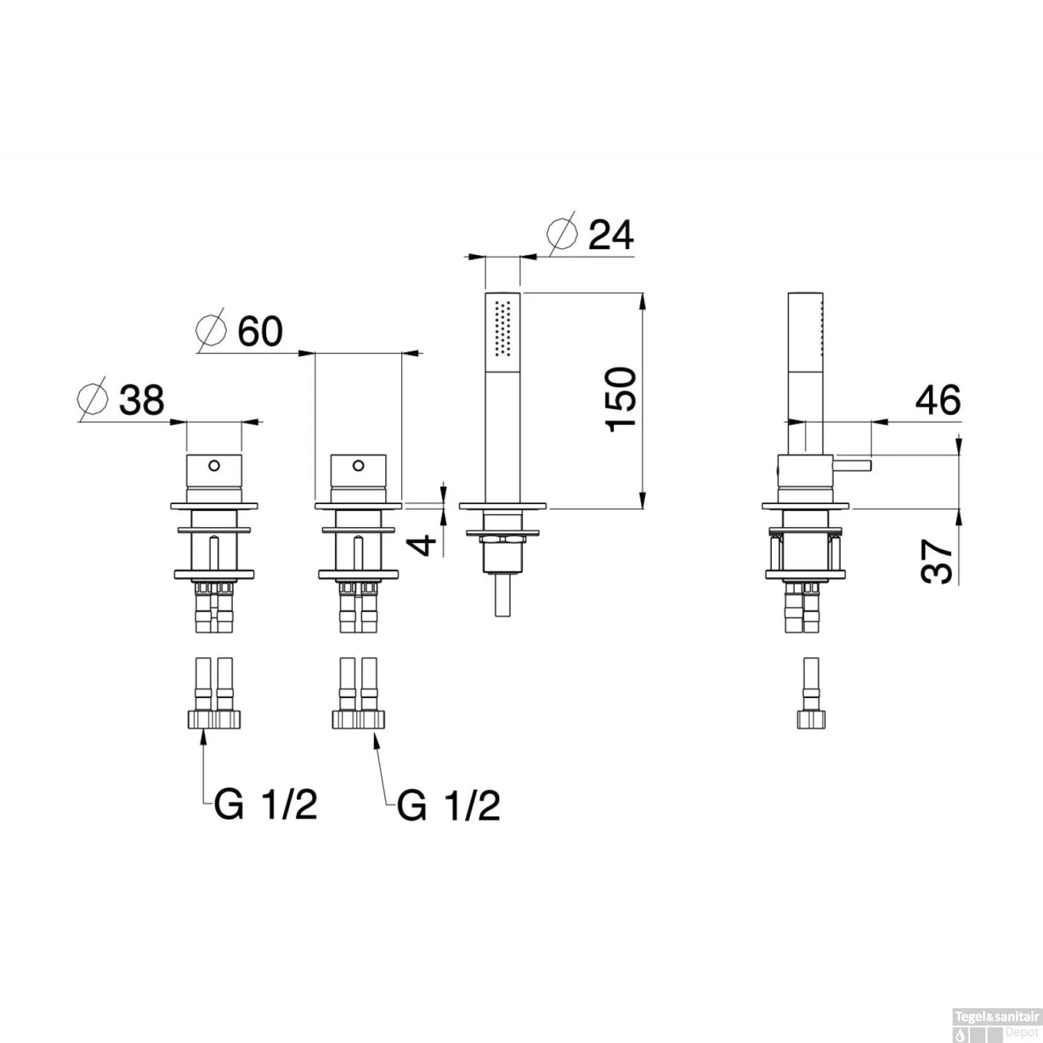 Specificaties Badrandcombinatie Lagoo Garda met Mengkraan, Omstel en Handdouche Messing Mat Zwart: