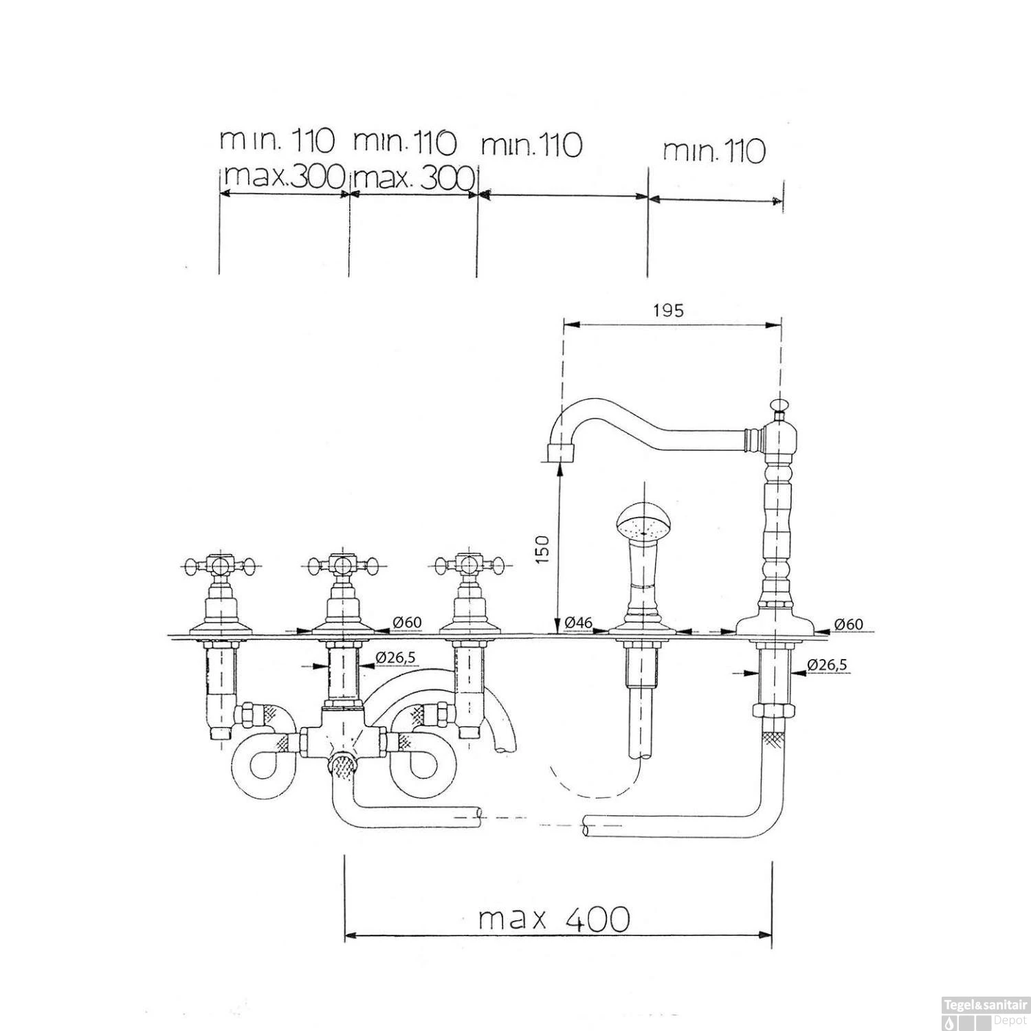 Specificaties Badrandkraan 3-kruisgreep Mengkraan Retro Compleet 5-gats Brons Sapho Antea: