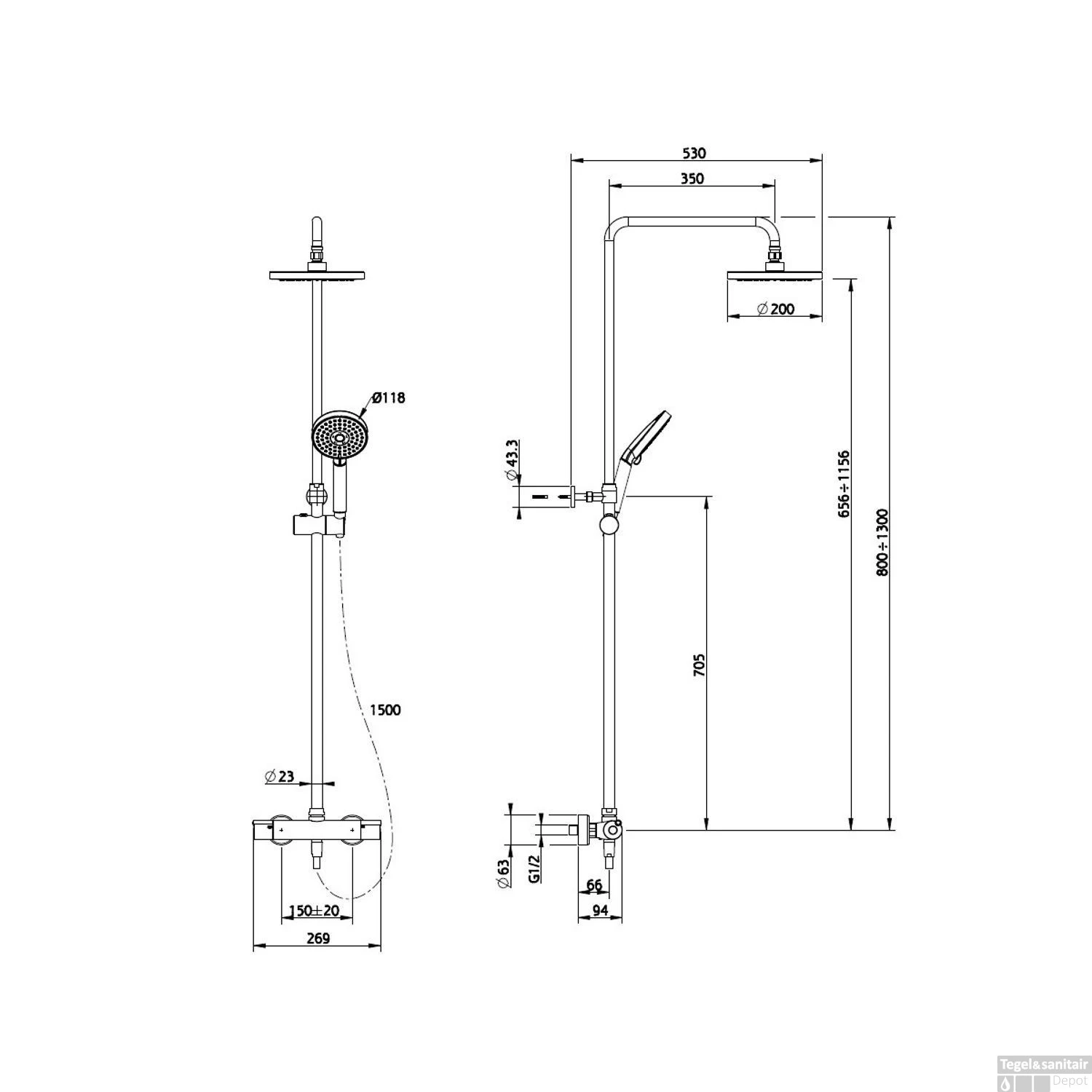 - Opbouw-muurbuis verstelbaar (80 cm & 129 cm)