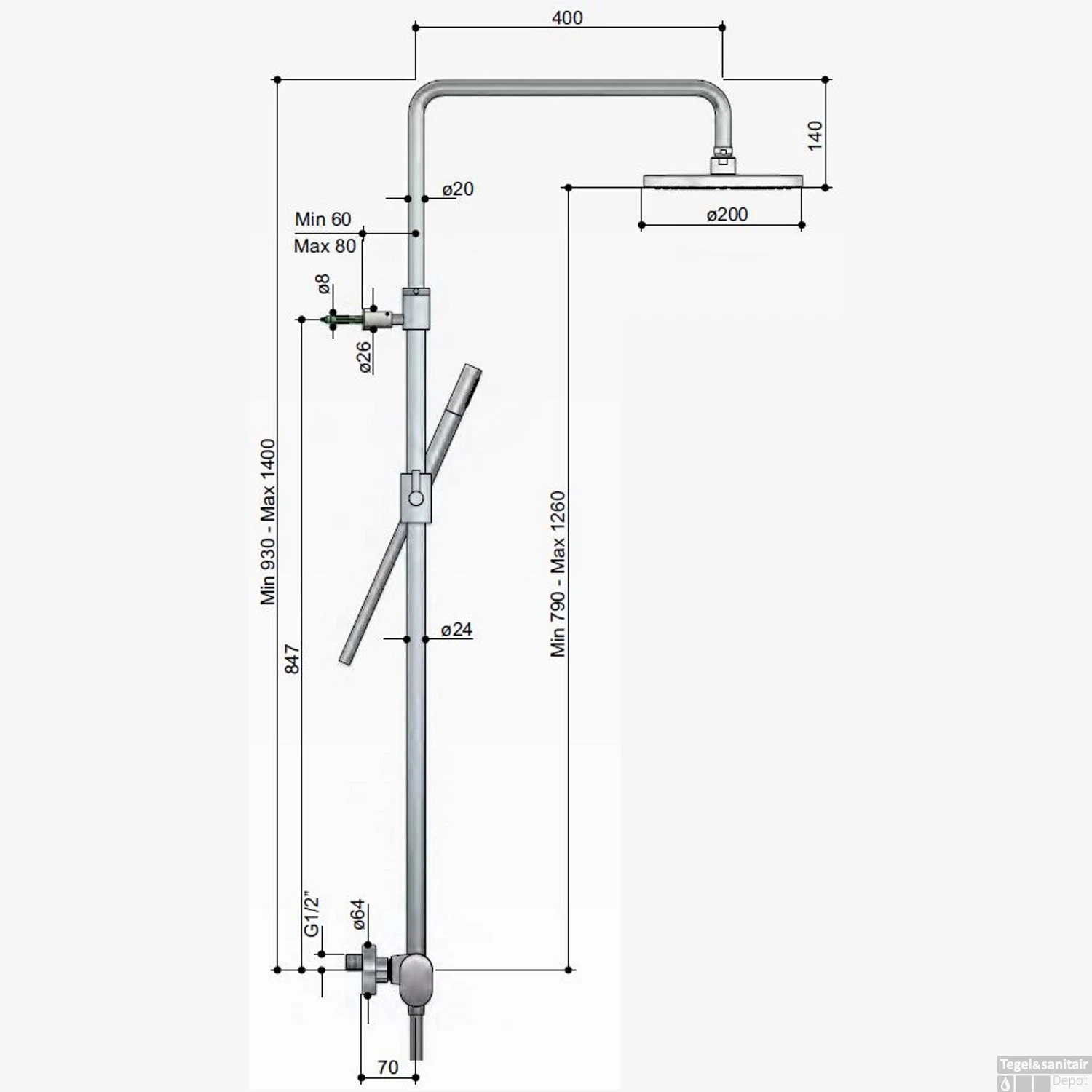- Afmeting hoofddouche: Doorsnee van 20, 25 of 30 cm.