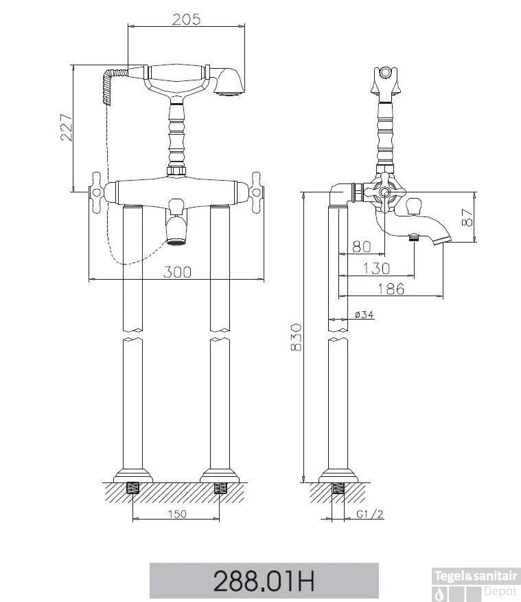 Merk Huber Thermostatisch Serie Croisette Montage Vrijstaand Kleur RVS Sfeerbeeld Nostalgisch Met douchegarnituur Hartafstand 150 Vrijstaand Inbouw Aantal Gaten 2 Artikelnummer 28801HNS Fabrieksartikelnummer 28801HNS