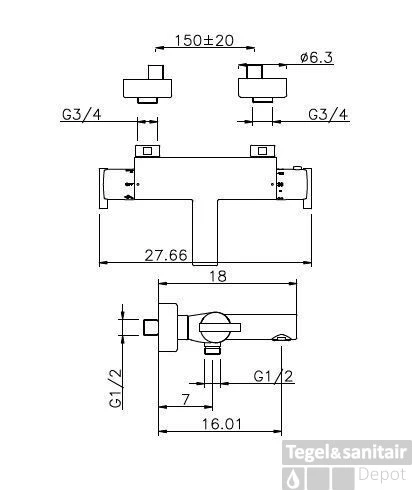 Hartafstand 150 Sfeerbeeld Modern Thermostatisch Serie Tratto Kleur Chroom Merk Huber Met douchegarnituur Artikelnummer TTT2101021 Fabrieksartikelnummer TTT2101021
