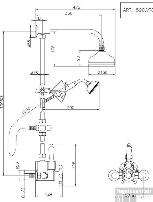 Serie Victorian Diameter hoofddouche 150 mm Thermostatisch Hoogte 1095 mm Inbouw Merk Huber Kleur RVS Sfeerbeeld Nostalgisch Artikelnummer 590VT01HNS Fabrieksartikelnummer 590VT01HNS