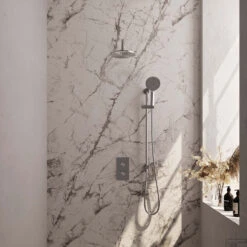 De hoofddouche heeft een diameter van 20 cm en is voorzien van siliconen sproeigaatjes waardoor ontkalken van de hoofddouche zeer gemakkelijk is. De wandarm heeft een lengte van 40 cm en een diameter van 2.2 cm. De handdouche bewaart u eenvoudig in de meegeleverde glijstang. De glijstang heeft een lengte van 70 cm. De handdouche beschikt over drie verschillende standen waar u eenvoudig tussen kunt wisselen. In combinatie met de doucheslang (lengte van 150 cm) wordt deze fraaie inbouw regendouche set compleet gemaakt.