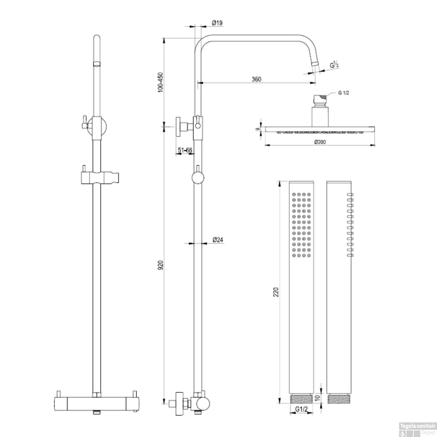 De lengte van de glijstang van deze regendoucheset is 91 cm. De set is ook voorzien van een doucheslang van 150 cm en een thermostaat die voorzien is van temperatuur blokkering op 38 graden.