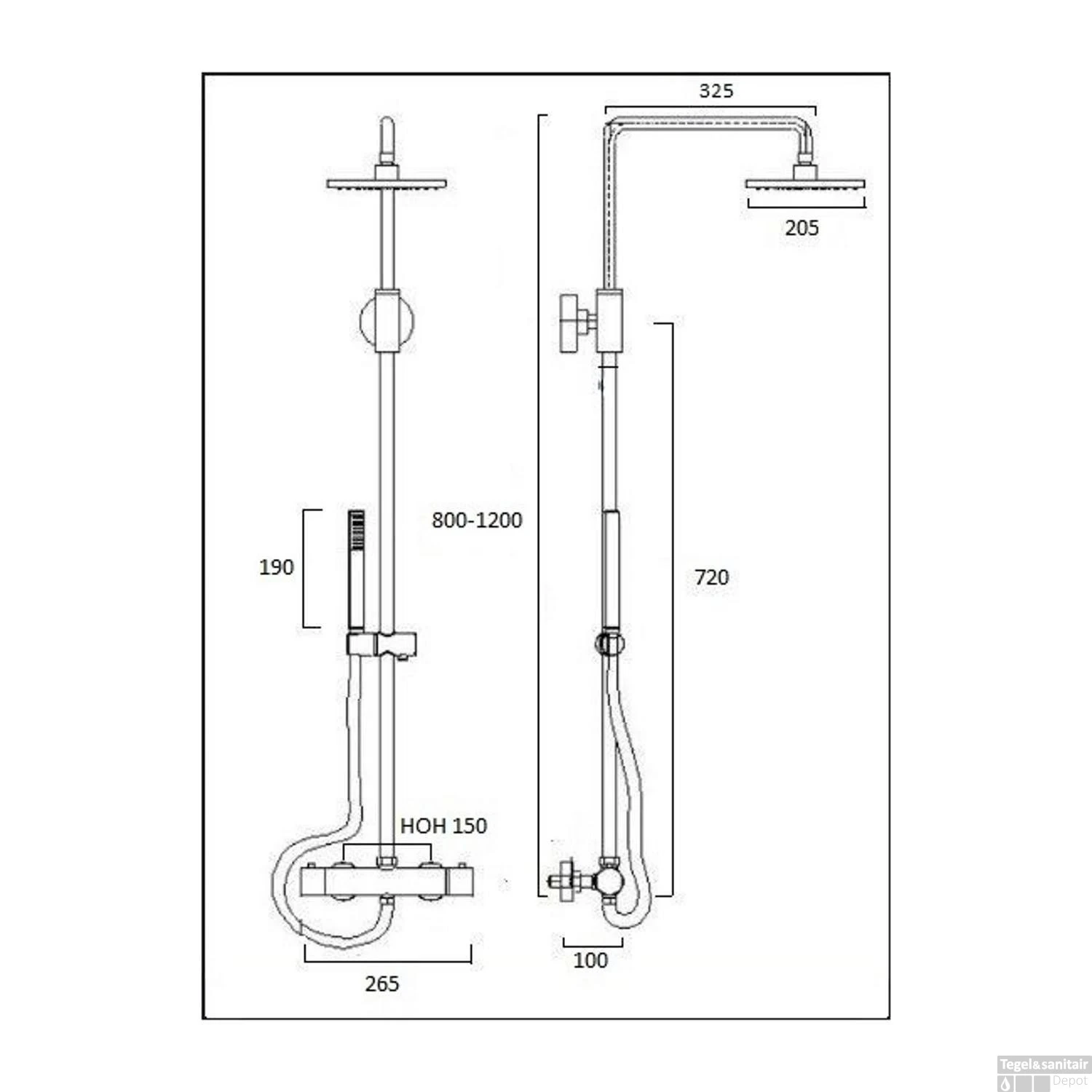 De regendouche is gemaakt van 304-RVS, ook wel roestvrij staal genoemd. De hoofddouche, de staafhanddouche, de thermostaatkraan, de doucheslang, de knoppen en de glijstang zijn allemaal gemaakt van volledig RVS. De 3 standen handdouche is gemaakt van kunststof. RVS is een zeer hoogwaardig materiaal en bij uitstek geschikt voor natte ruimtes. De thermostaatkraan is voorzien van keramische schijven wat zorgt voor soepele bewegingen en een lange levensduur. De set wordt compleet met s-koppelingen geleverd. De kraan aansluitmaat is 15cm hart op hart.