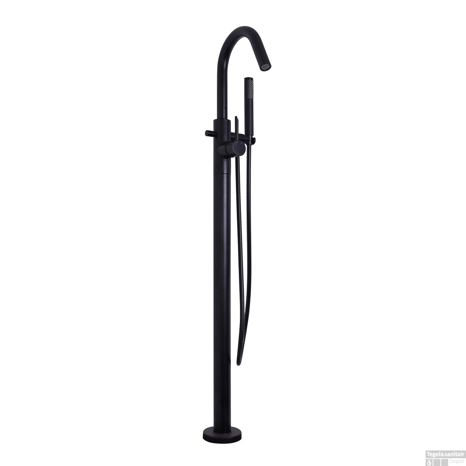 Deze vrijstaande badkraan staat garant voor kwaliteit en design. Het betreft een complete set bestaande uit een badkraan, een handdouche en een doucheslang. Alle elementen van deze set zijn afgewerkt in de kleur mat zwart, wat een luxe en moderne uitstraling aan uw badkamer geeft.