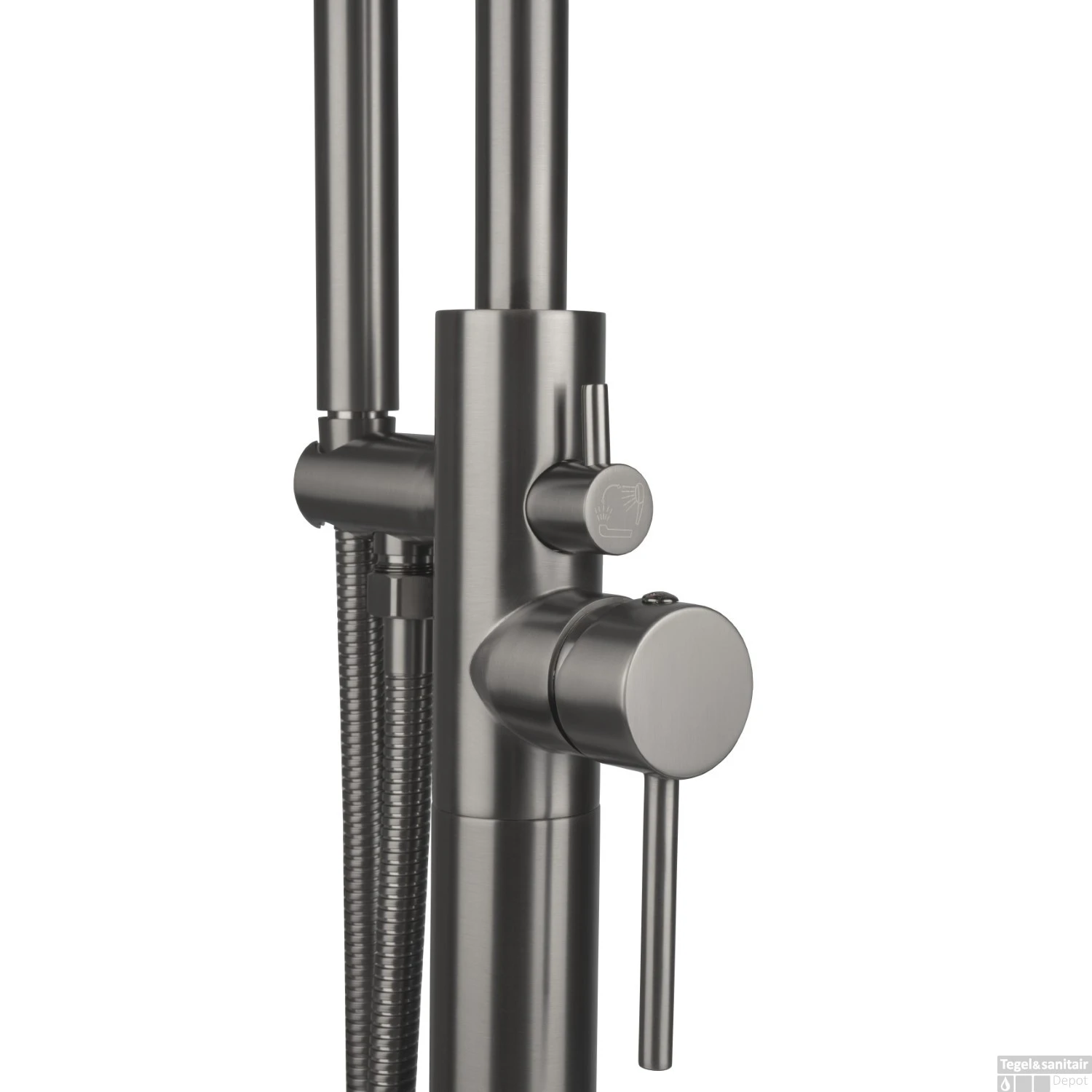 Met de ‘Colorato’ vrijstaande badkraan van het merk Boss & Wessing haalt u een bijzondere kraan in huis. De kraan is gemaakt van messing en heeft een afwerking in de kleur gunmetal. De vrijstaande badkraan is uitgerust met een handdoucheset die bestaat uit een doucheslang en een staaf handdouche. De vrijstaande badkraan kan uitstekend gecombineerd worden met een (vrijstaand) ligbad.
