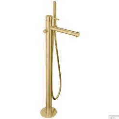 De Design IX vrijstaande badkraan van het merk Herzbach is een zeer stijlvolle toevoeging aan uw badkamerruimte. De kraan is gemaakt van edelstaal en kent een afwerking in de kleur messing goud. Daarnaast is deze bijzondere kraan ook leverbaar in de kleuren koper en zwart. De vrijstaande badkraan kunt u uitstekend combineren met een ligbad om zo een sfeervol geheel te creëren. De Design IX is uitgerust met een doucheslang en een staaf handdouche, wat deze kraan zeer multifunctioneel maakt.