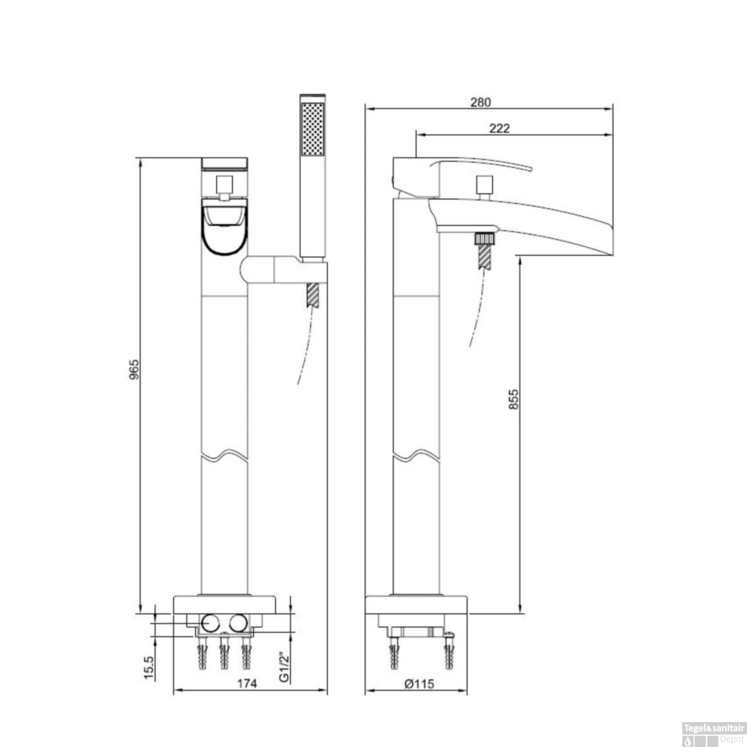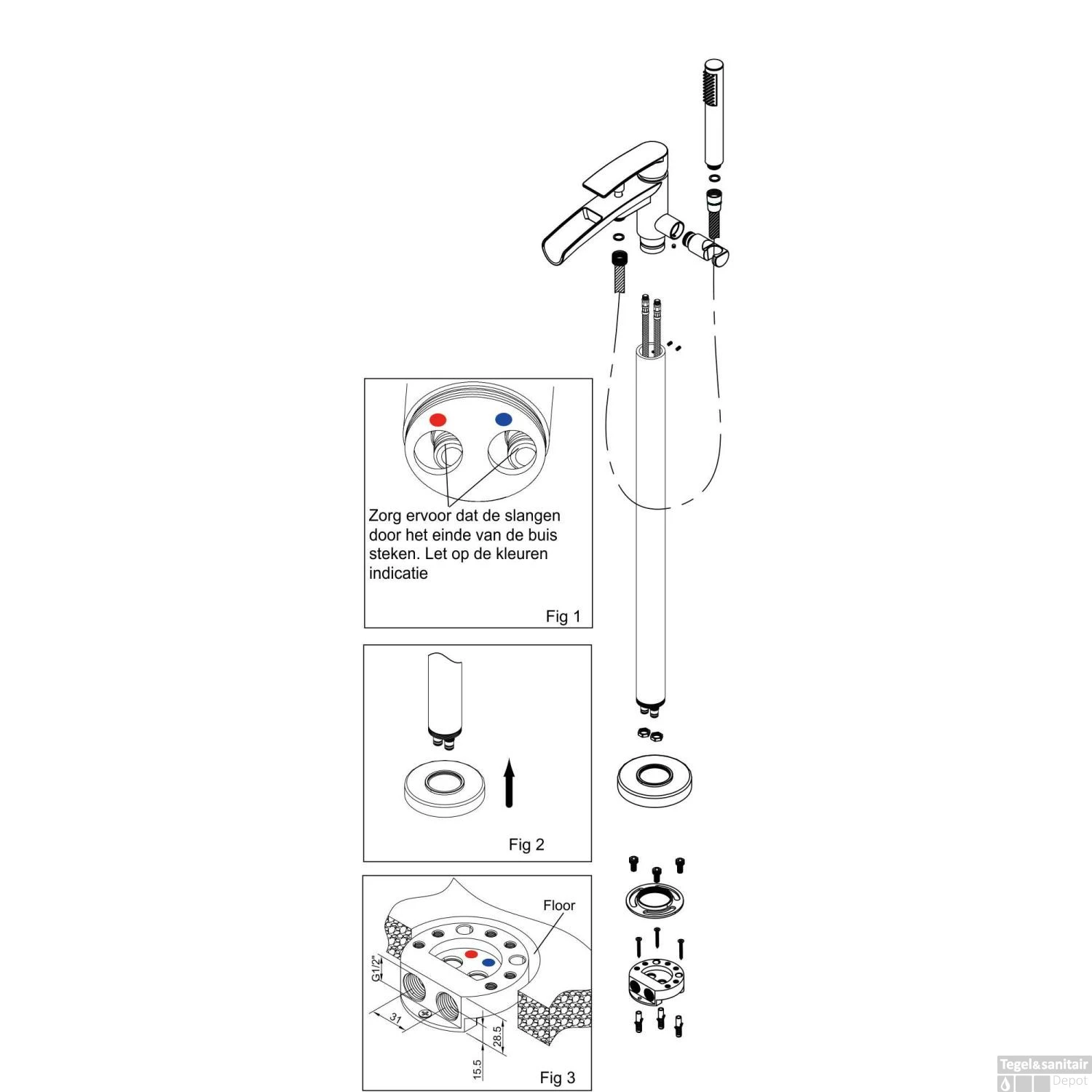 De vrijstaande badmengkraan bevat een mooie handdouche waarvan het handvat doorloopt in de sproeikop. De Handdouche bevat een flexibele slang en is erg handig om het bad schoon te maken of om uzelf aftespoelen na het baden.