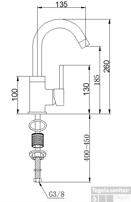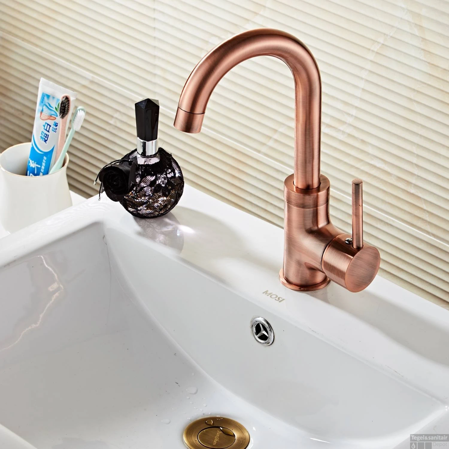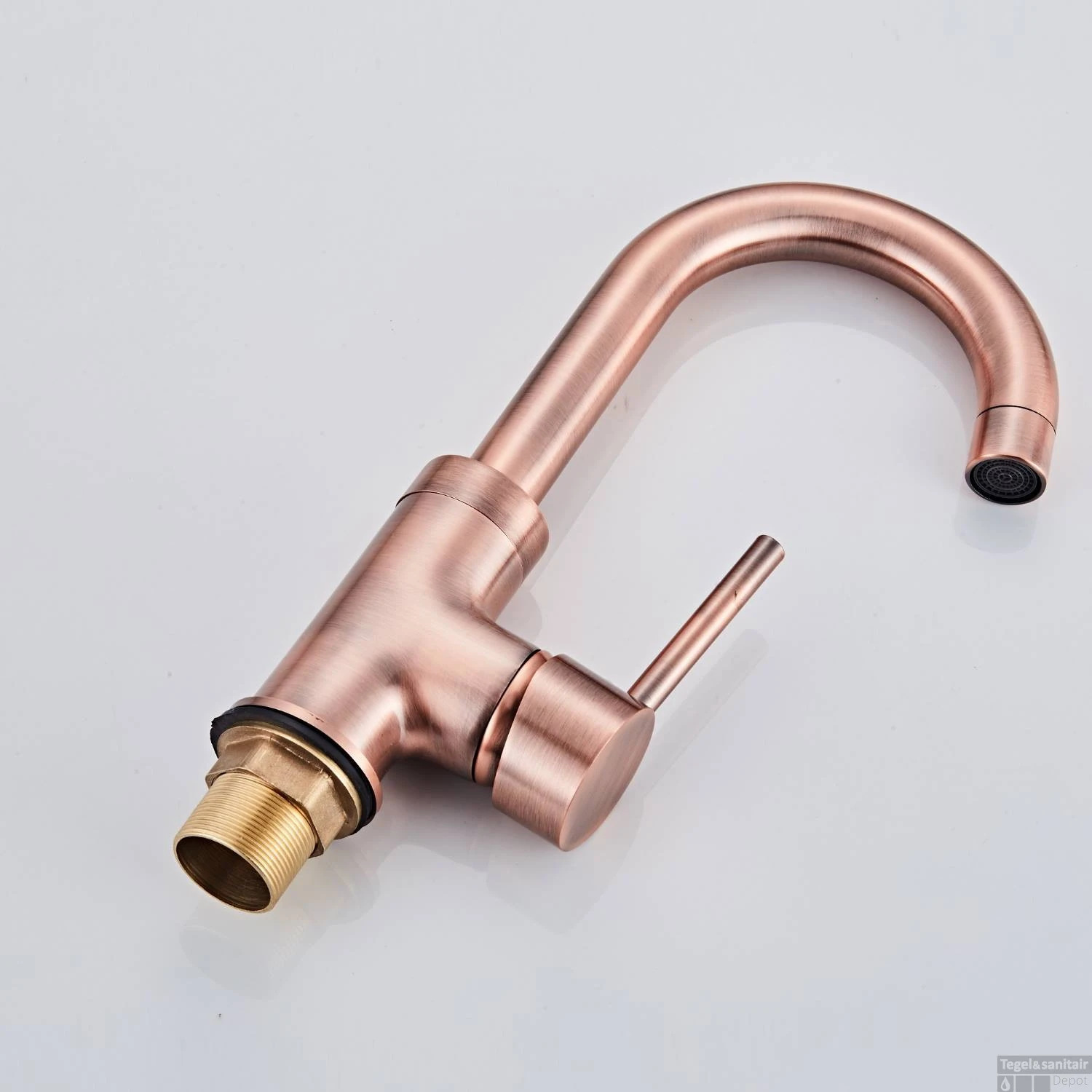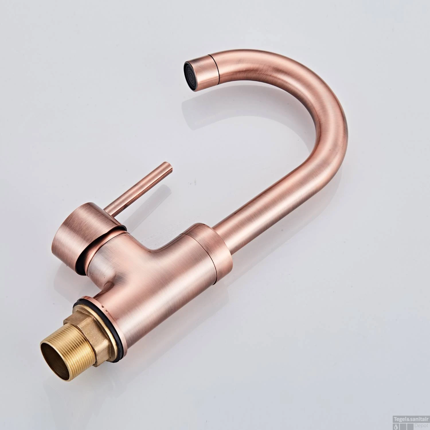 De koper kleurige wastafelkraan heeft een hoge uitloop en is gemaakt van messing. Erg praktisch is dat de uitloop volledig rond kan draaien. Zit deze in de weg, draai de uitloop aan de kant zodat u de ruimte heeft die nodig is.