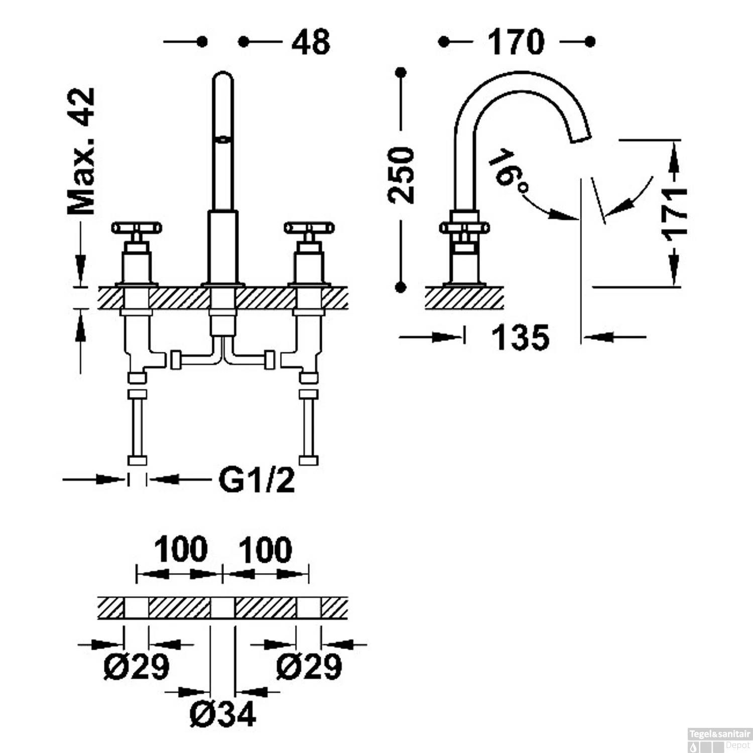 De diepte van de kraan is 17 cm. Verder is de draadaansluiting 1/2″ en omdat de kruisgrepen apart zitten van de uitloop, zijn er twee draadaansluitingen. De kraan heeft de kleur RVS Look.